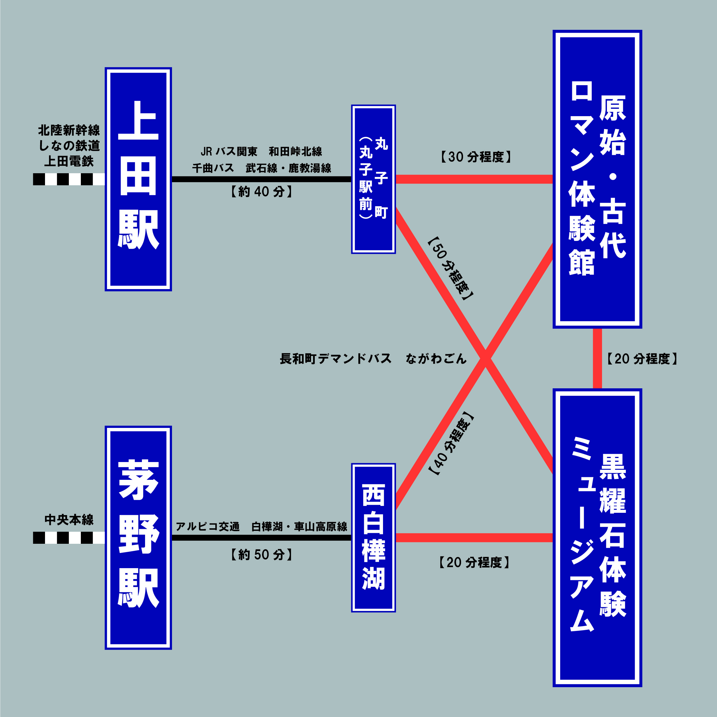 北陸新幹線・上田駅、中央本線・茅野駅からバスでご来館いただけます。
